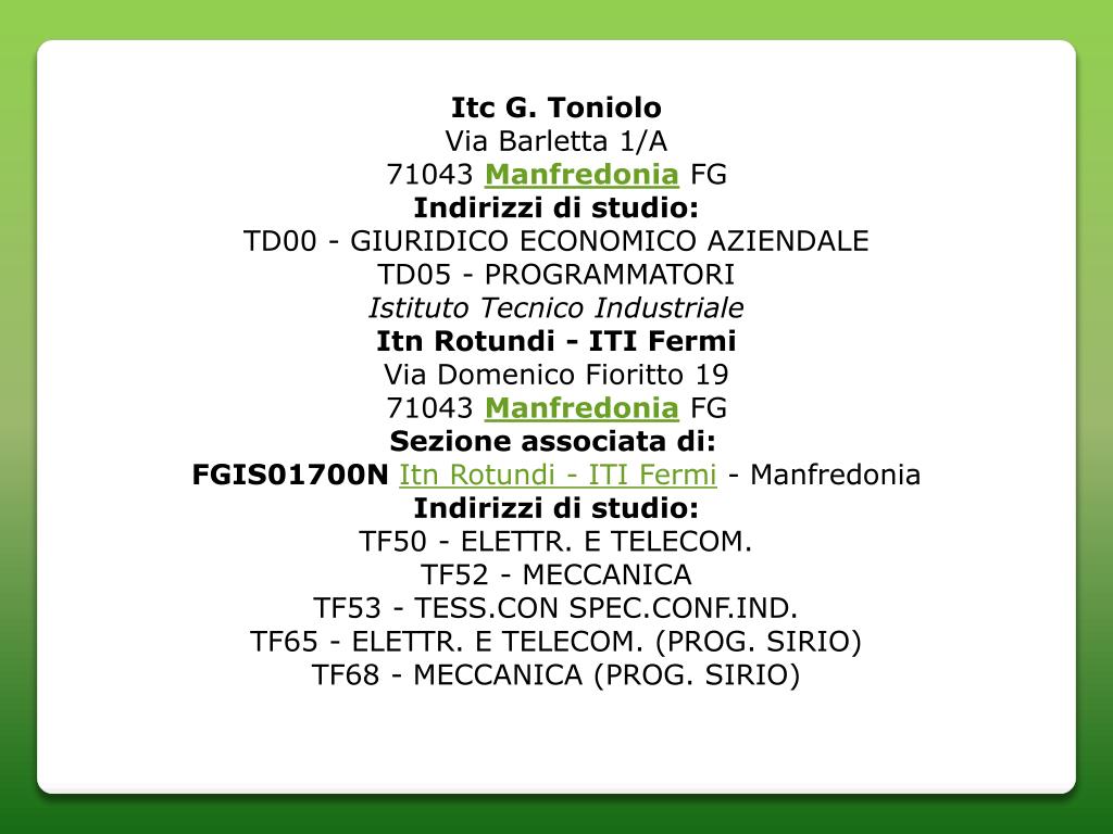 Itc G. Toniolo Via Barletta 1/A71043 Manfredonia FG Indirizzi di studio: TD00 - GIURIDICO ECONOMICO AZIENDALETD05 - PROGRAMMATORI Istituto Tecnico Industriale Itn Rotundi - ITI Fermi Via Domenico Fioritto 1971043 Manfredonia FG Sezione associata di: FGIS01700NItn Rotundi - ITI Fermi - Manfredonia Indirizzi di studio: TF50 - ELETTR. E TELECOM.TF52 - MECCANICATF53 - TESS.CON SPEC.CONF.IND.TF65 - ELETTR. E TELECOM. (PROG. SIRIO)TF68 - MECCANICA (PROG. SIRIO)