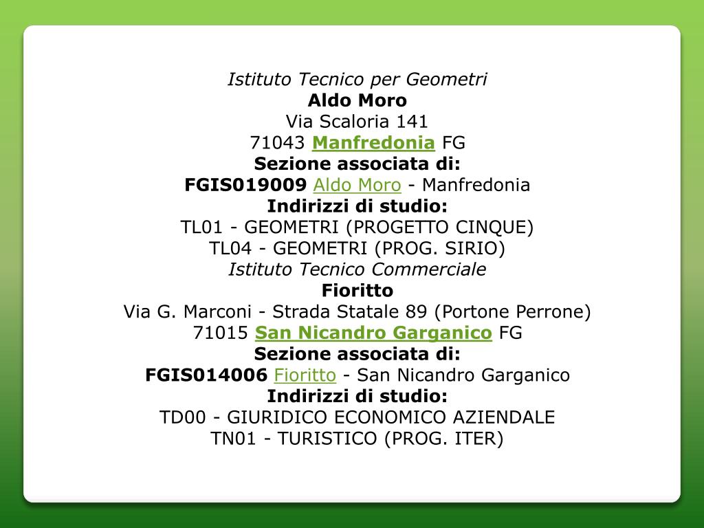 Istituto Tecnico per Geometri Aldo Moro Via Scaloria 14171043 Manfredonia FG Sezione associata di: FGIS019009Aldo Moro - Manfredonia Indirizzi di studio: TL01 - GEOMETRI (PROGETTO CINQUE)TL04 - GEOMETRI (PROG. SIRIO) Istituto Tecnico Commerciale Fioritto Via G. Marconi - Strada Statale 89 (Portone Perrone)71015 San Nicandro Garganico FG Sezione associata di: FGIS014006Fioritto - San Nicandro Garganico Indirizzi di studio: TD00 - GIURIDICO ECONOMICO AZIENDALETN01 - TURISTICO (PROG. ITER)