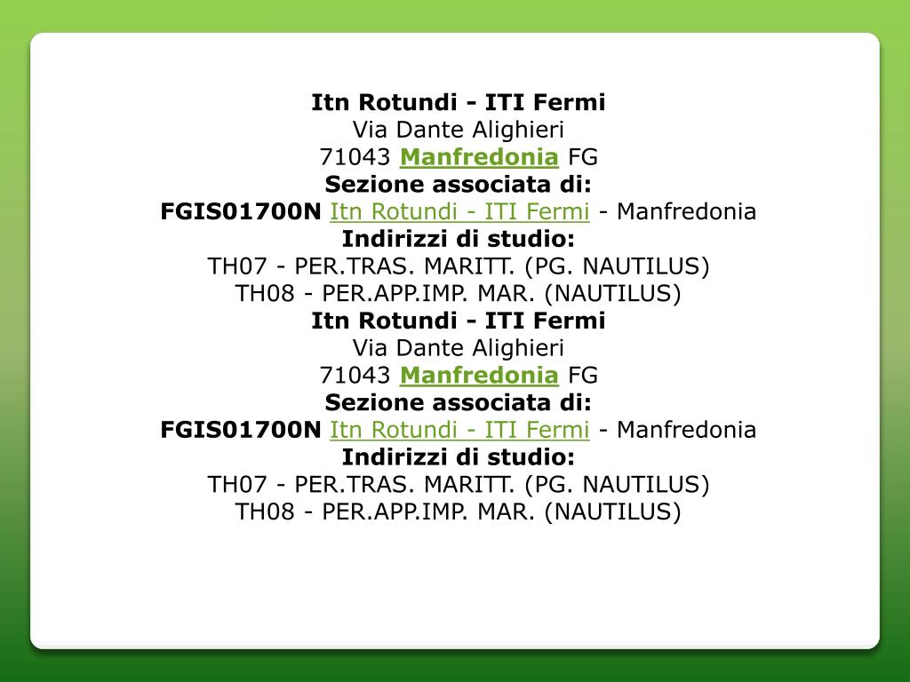 Itn Rotundi - ITI Fermi Via Dante Alighieri71043 Manfredonia FG Sezione associata di: FGIS01700NItn Rotundi - ITI Fermi - Manfredonia Indirizzi di studio: TH07 - PER.TRAS. MARITT. (PG. NAUTILUS)TH08 - PER.APP.IMP. MAR. (NAUTILUS) Itn Rotundi - ITI Fermi Via Dante Alighieri71043 Manfredonia FG Sezione associata di: FGIS01700NItn Rotundi - ITI Fermi - Manfredonia Indirizzi di studio: TH07 - PER.TRAS. MARITT. (PG. NAUTILUS)TH08 - PER.APP.IMP. MAR. (NAUTILUS)