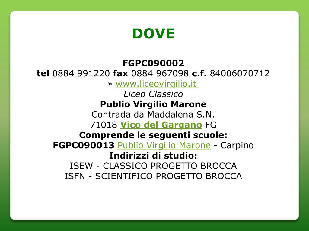 DOVE FGPC090002 tel 0884 991220 fax 0884 967098 c.f. 84006070712 » www.liceovirgilio.it Liceo Classico Publio Virgilio Marone Contrada da Maddalena S.N.71018 Vico del Gargano FG Comprende le seguenti scuole: FGPC090013Publio Virgilio Marone - Carpino Indirizzi di studio: ISEW - CLASSICO PROGETTO BROCCAISFN - SCIENTIFICO PROGETTO BROCCA