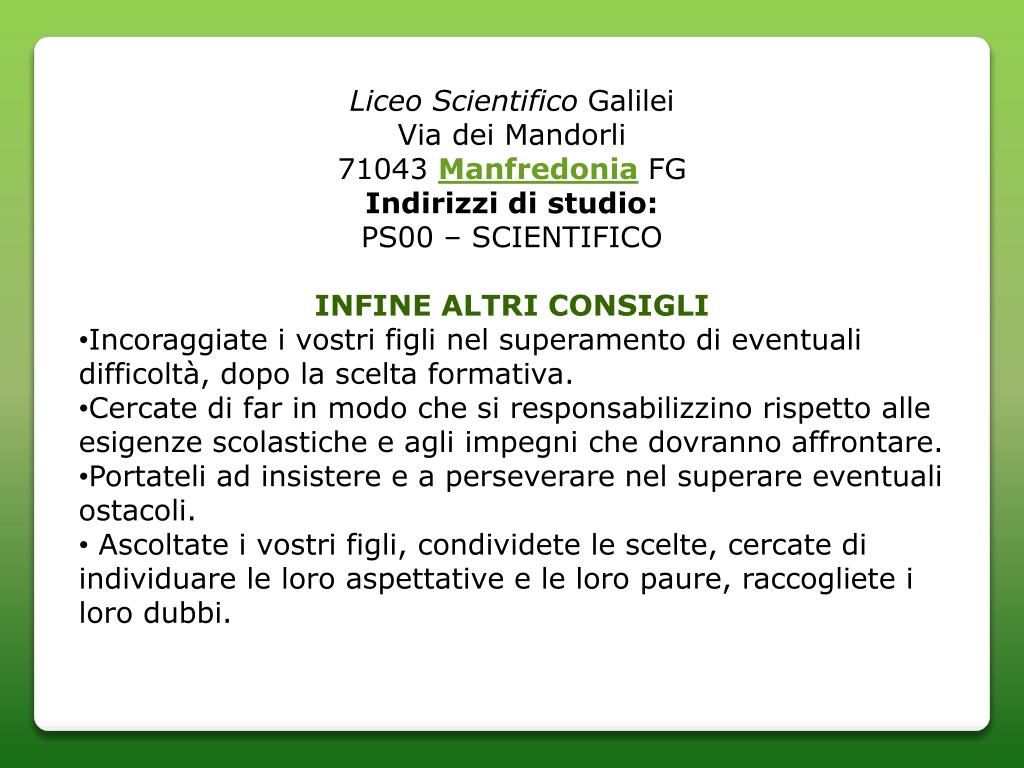 Liceo Scientifico Galilei • Via dei Mandorli71043 Manfredonia FG • Indirizzi di studio: • PS00 – SCIENTIFICO • INFINE ALTRI CONSIGLI • Incoraggiate i vostri figli nel superamento di eventuali difficoltà, dopo la scelta formativa. • Cercate di far in modo che si responsabilizzino rispetto alle esigenze scolastiche e agli impegni che dovranno affrontare. • Portateli ad insistere e a perseverare nel superare eventuali ostacoli. • Ascoltate i vostri figli, condividete le scelte, cercate di individuare le loro aspettative e le loro paure, raccogliete i loro dubbi.
