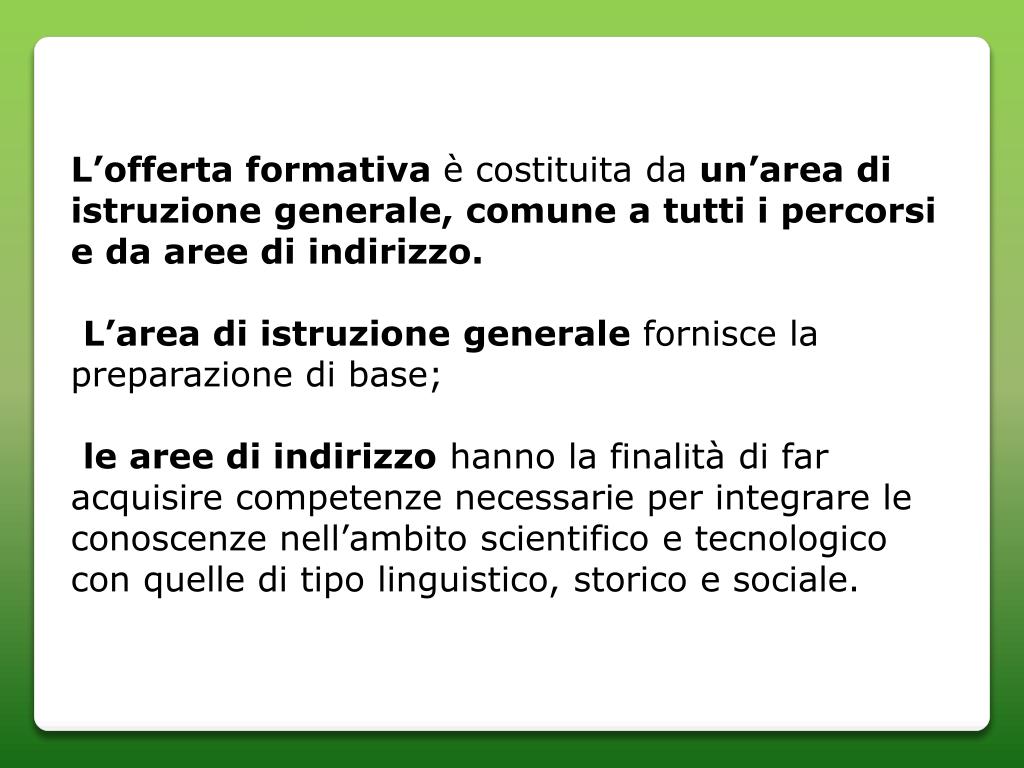 L’offerta formativa è costituita da un’area di istruzione generale, comune a tutti i percorsi e da aree di indirizzo. L’area di istruzione generale fornisce la preparazione di base; le aree di indirizzo hanno la finalità di far acquisire competenze necessarie per integrare le conoscenze nell’ambito scientifico e tecnologico con quelle di tipo linguistico, storico e sociale.