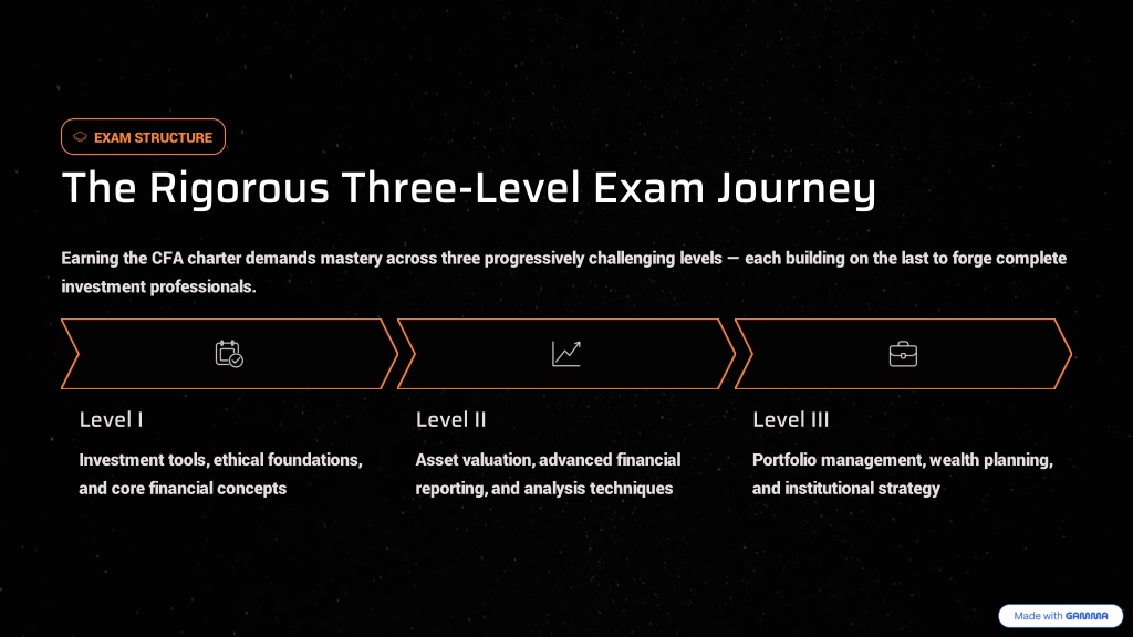 EXAM STRUCTURE The Rigorous Three-Level Exam Journey Earning the CFA charter demands mastery across three progressively challenging levels — each building on the last to forge complete investment professionals. Level I Level II Level III Investment tools, ethical foundations, and core financial concepts Asset valuation, advanced financial reporting, and analysis techniques Portfolio management, wealth planning, and institutional strategy