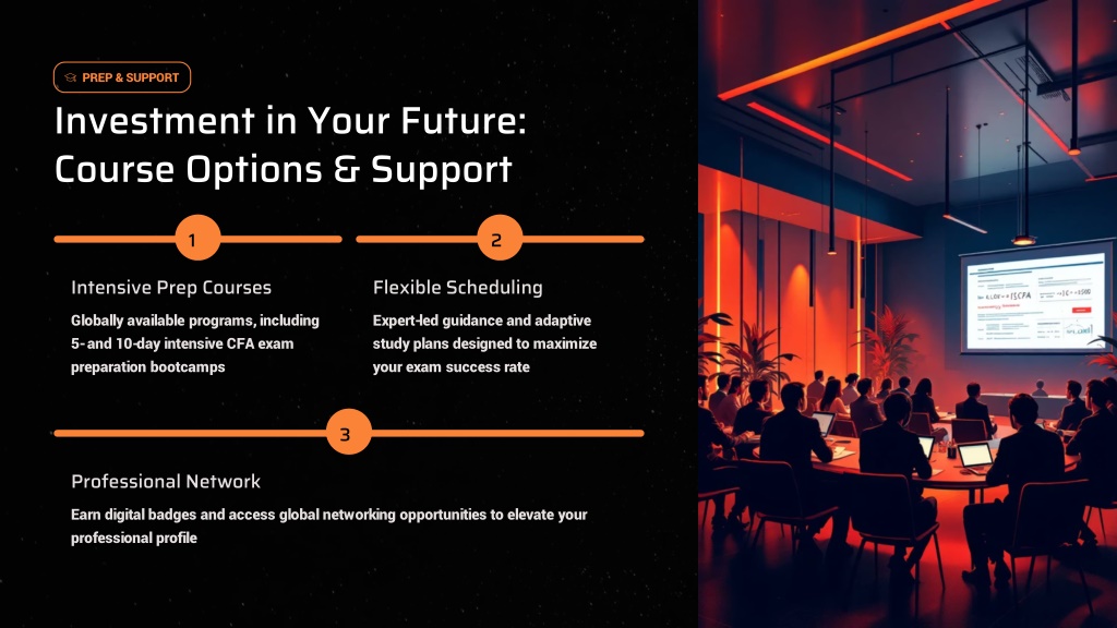PREP & SUPPORT Investment in Your Future: Course Options & Support 1 2 Intensive Prep Courses Flexible Scheduling Globally available programs, including 5- and 10-day intensive CFA exam preparation bootcamps Expert-led guidance and adaptive study plans designed to maximize your exam success rate 3 Professional Network Earn digital badges and access global networking opportunities to elevate your professional profile