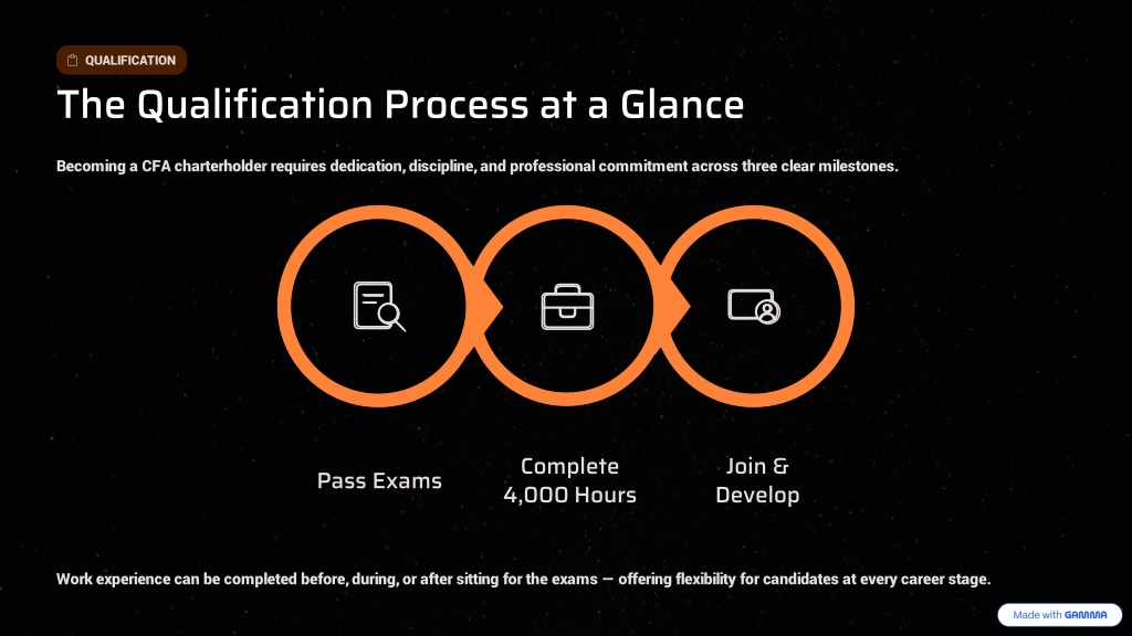 QUALIFICATION The Qualification Process at a Glance Becoming a CFA charterholder requires dedication, discipline, and professional commitment across three clear milestones. Complete 4,000 Hours Join & Develop Pass Exams Work experience can be completed before, during, or after sitting for the exams — offering flexibility for candidates at every career stage.