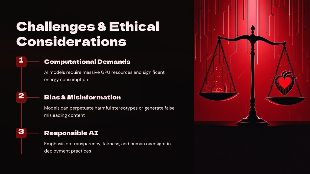 Challenges & Ethical Considerations 1 Computational Demands AI models require massive GPU resources and significant energy consumption 2 Bias & Misinformation Models can perpetuate harmful stereotypes or generate false, misleading content 3 Responsible AI Emphasis on transparency, fairness, and human oversight in deployment practices