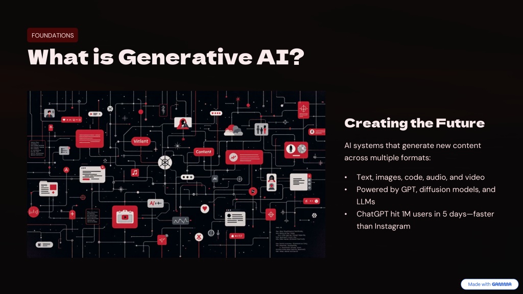 FOUNDATIONS What is Generative AI? Creating the Future AI systems that generate new content across multiple formats: • Text, images, code, audio, and video • Powered by GPT, diffusion models, and LLMs • ChatGPT hit 1M users in 5 days—faster than Instagram