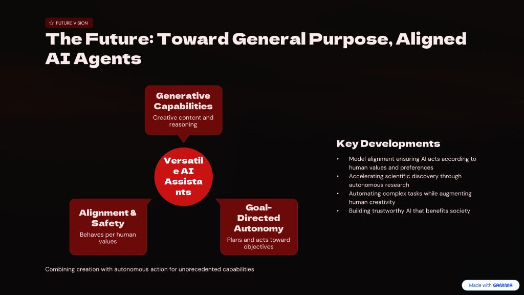 FUTURE VISION The Future: Toward General Purpose, Aligned AI Agents Generative Capabilities Creative content and reasoning Key Developments • Model alignment ensuring AI acts according to human values and preferences • Accelerating scientific discovery through autonomous research • Automating complex tasks while augmenting human creativity • Building trustworthy AI that benefits society Versatile AI Assistants Goal-Directed Autonomy Alignment & Safety Behaves per human values Plans and acts toward objectives Combining creation with autonomous action for unprecedented capabilities
