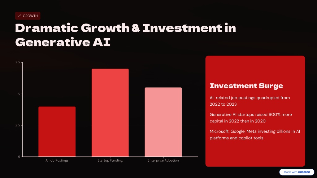 GROWTH Dramatic Growth & Investment in Generative AI Investment Surge AI-related job postings quadrupled from 2022 to 2023 Generative AI startups raised 600% more capital in 2022 than in 2020 Microsoft, Google, Meta investing billions in AI platforms and copilot tools