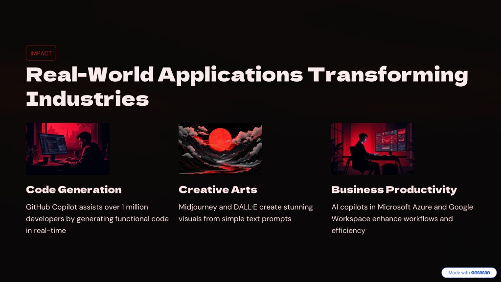 IMPACT Real-World Applications Transforming Industries Code Generation Creative Arts Business Productivity GitHub Copilot assists over 1 million developers by generating functional code in real-time Midjourney and DALL·E create stunning visuals from simple text prompts AI copilots in Microsoft Azure and Google Workspace enhance workflows and efficiency