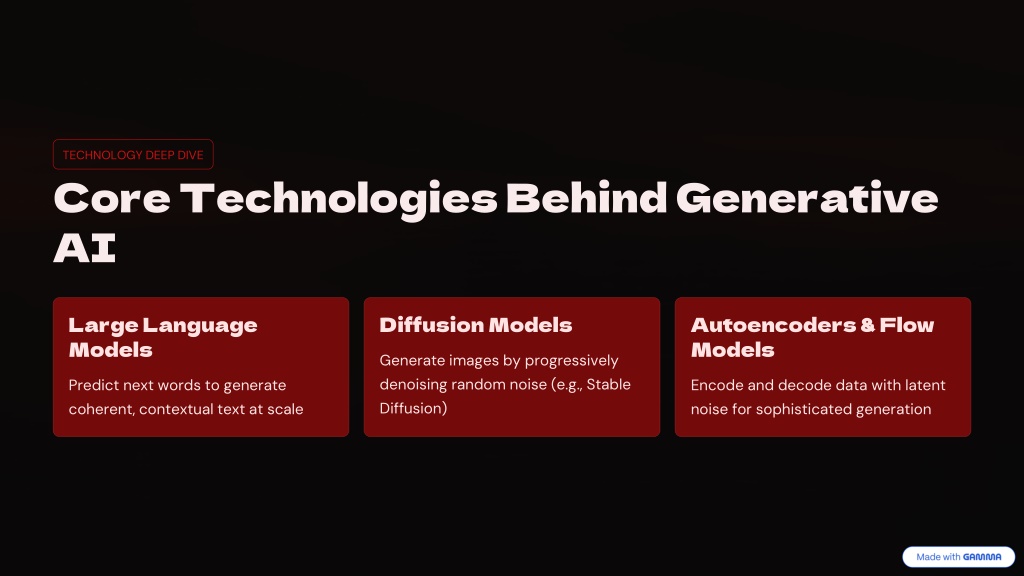 TECHNOLOGY DEEP DIVE Core Technologies Behind Generative AI Large Language Models Diffusion Models Autoencoders & Flow Models Generate images by progressively denoising random noise (e.g., Stable Diffusion) Predict next words to generate coherent, contextual text at scale Encode and decode data with latent noise for sophisticated generation