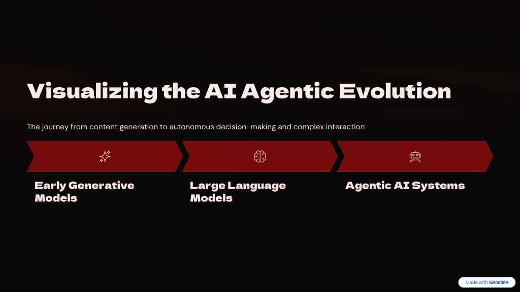 Visualizing the AI Agentic Evolution The journey from content generation to autonomous decision-making and complex interaction Early Generative Models Large Language Models Agentic AI Systems