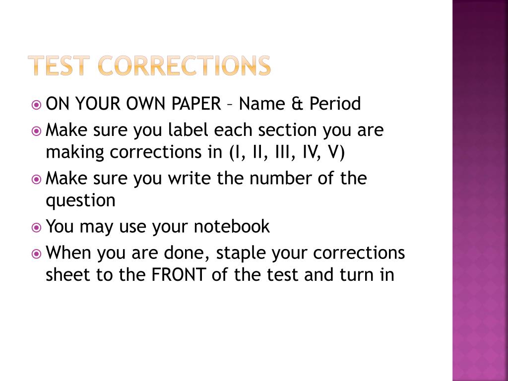 Test corrections • ON YOUR OWN PAPER – Name & Period • Make sure you label each section you are making corrections in (I, II, III, IV, V) • Make sure you write the number of the question • You may use your notebook • When you are done, staple your corrections sheet to the FRONT of the test and turn in