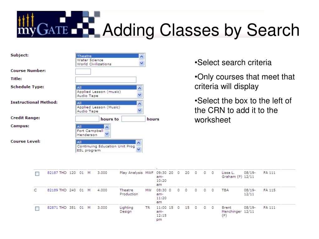 Adding Classes by Search • Select search criteria • Only courses that meet that criteria will display • Select the box to the left of the CRN to add it to the worksheet