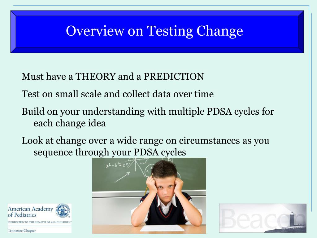 Overview on Testing Change Must have a THEORY and a PREDICTION Test on small scale and collect data over time Build on your understanding with multiple PDSA cycles for each change idea Look at change over a wide range on circumstances as you sequence through your PDSA cycles