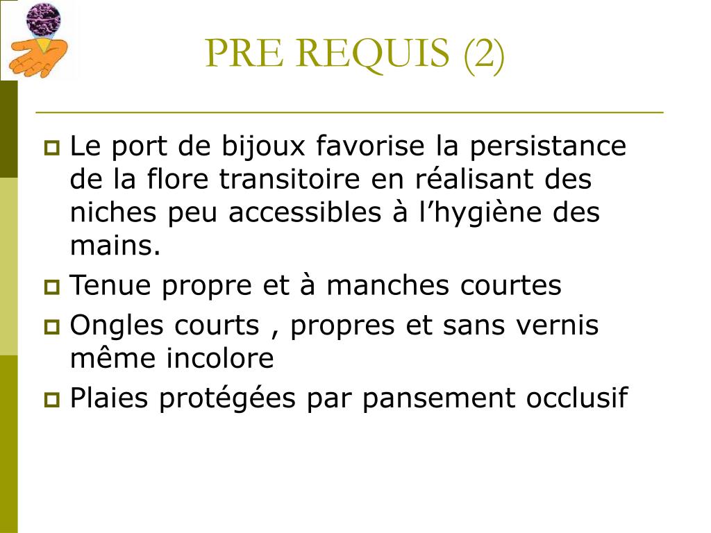 PRE REQUIS (2) • Le port de bijoux favorise la persistance de la flore transitoire en réalisant des niches peu accessibles à l’hygiène des mains. • Tenue propre et à manches courtes • Ongles courts , propres et sans vernis même incolore • Plaies protégées par pansement occlusif