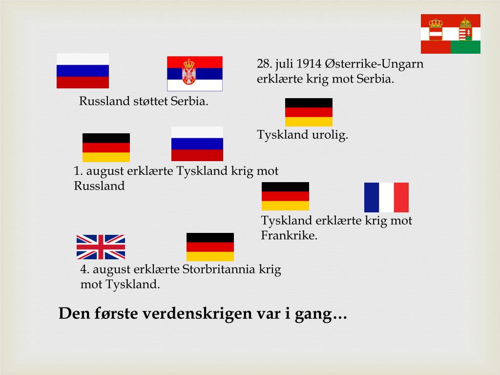 28. juli 1914 Østerrike-Ungarn erklærte krig mot Serbia. Russland støttet Serbia. Tyskland urolig. 1. august erklærte Tyskland krig mot Russland Tyskland erklærte krig mot Frankrike. 4. august erklærte Storbritannia krig mot Tyskland. Den første verdenskrigen var i gang…