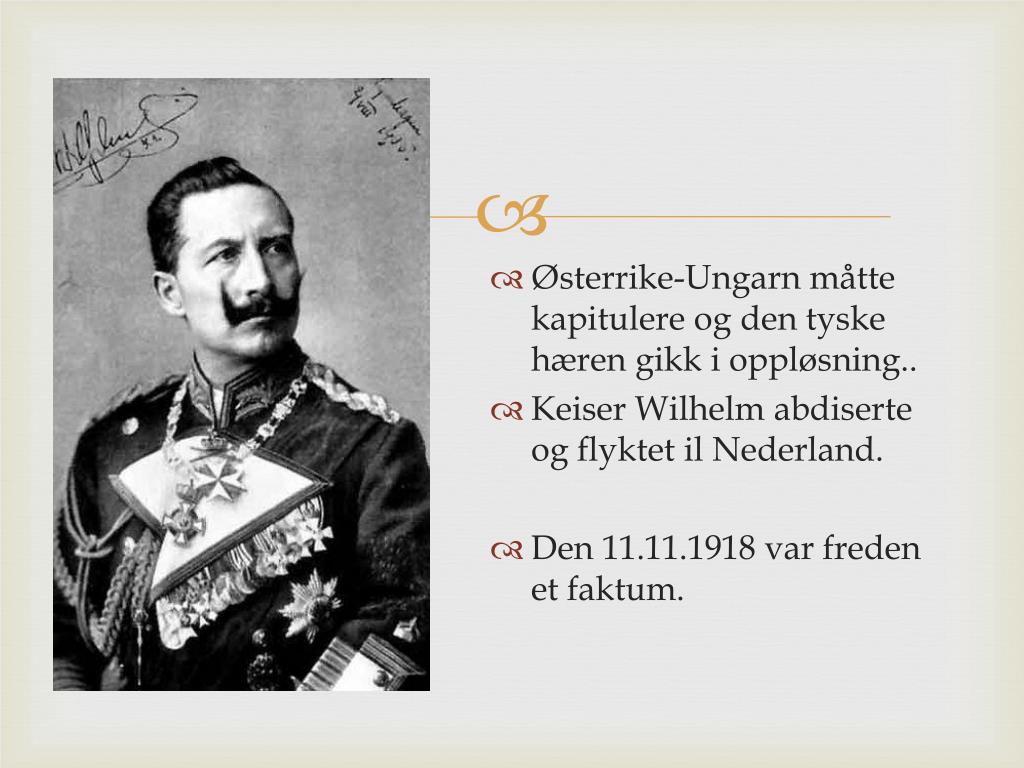 Østerrike-Ungarn måtte kapitulere og den tyske hæren gikk i oppløsning.. • Keiser Wilhelm abdiserte og flyktet il Nederland. • Den 11.11.1918 var freden et faktum.
