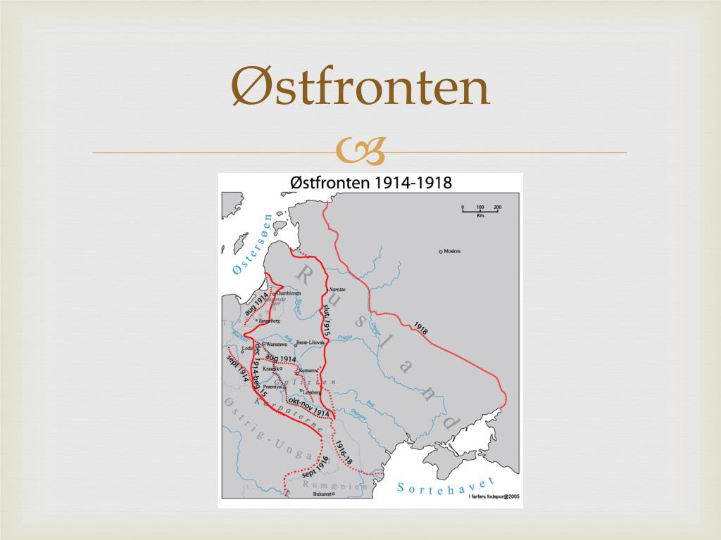 Tyskland seirer på østfronten • Østfronten utviklet seg aldri til noen skyttergravskrig. • Tyskland vant de fleste slagene og rykket stadig lenger inn i Russland. • 1916 gikk Russland til et storangrep, men klarte heller ikke denne gangen å overvinne Tyskland. • Vinteren 1916-1917 begynte den russiske hæren å gå i oppløsning.