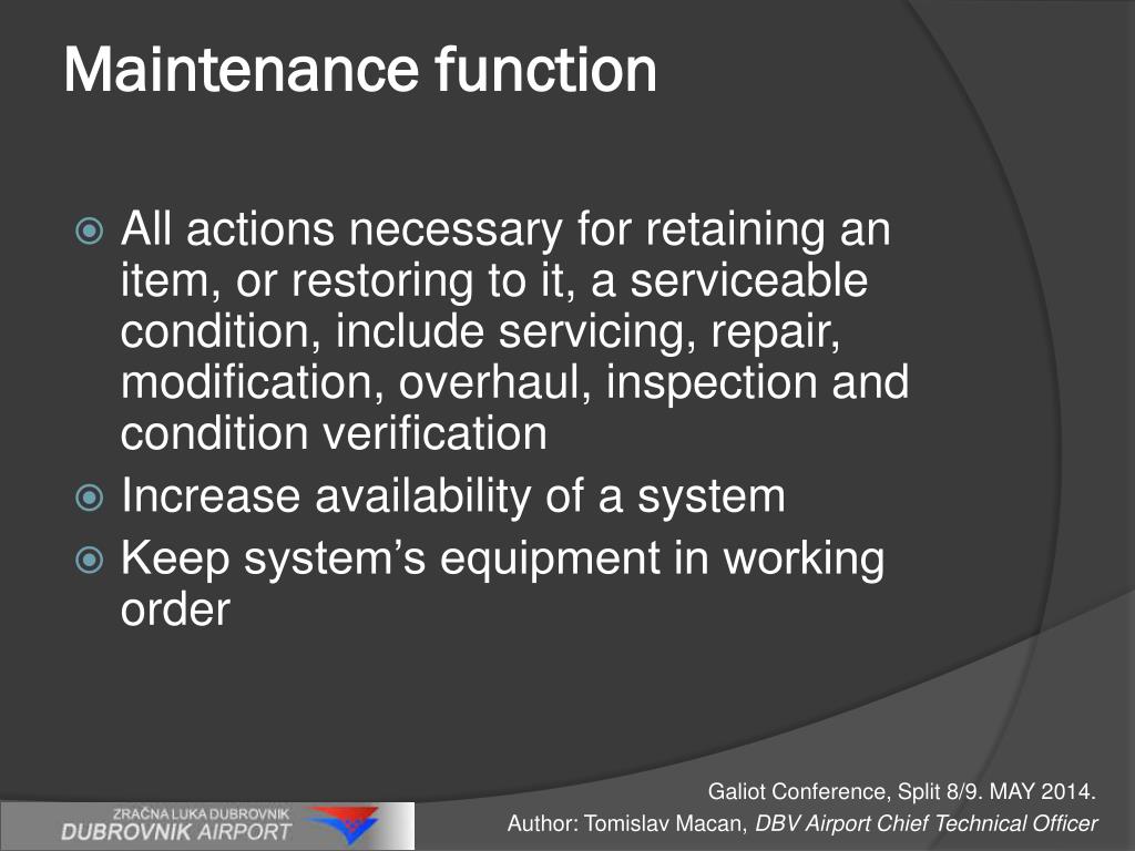 Maintenance function • All actions necessary for retaining an item, or restoring to it, a serviceable condition, include servicing, repair, modification, overhaul, inspection and condition verification • Increase availability of a system • Keep system’s equipment in working order • Galiot Conference, Split 8/9. MAY 2014. • Author: Tomislav Macan, DBV Airport Chief Technical Officer