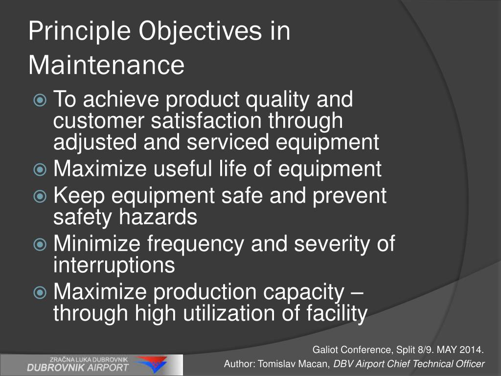 Maintenance Objectives • Must be consistent with the goals of production (cost, quality, delivery, safety) • Must be comprehensive and include specific responsibilities • Galiot Conference, Split 8/9. MAY 2014. • Author: Tomislav Macan, DBV Airport Chief Technical Officer
