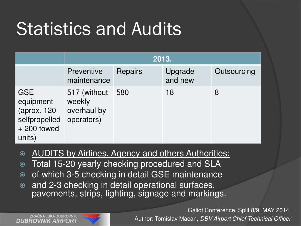 Statistics and Audits • AUDITS by Airlines, Agency and others Authorities: • Total 15-20 yearly checking procedured and SLA • of which 3-5 checking in detail GSE maintenance • and 2-3 checking in detail operational surfaces, pavements, strips, lighting, signage and markings. • Galiot Conference, Split 8/9. MAY 2014. • Author: Tomislav Macan, DBV Airport Chief Technical Officer