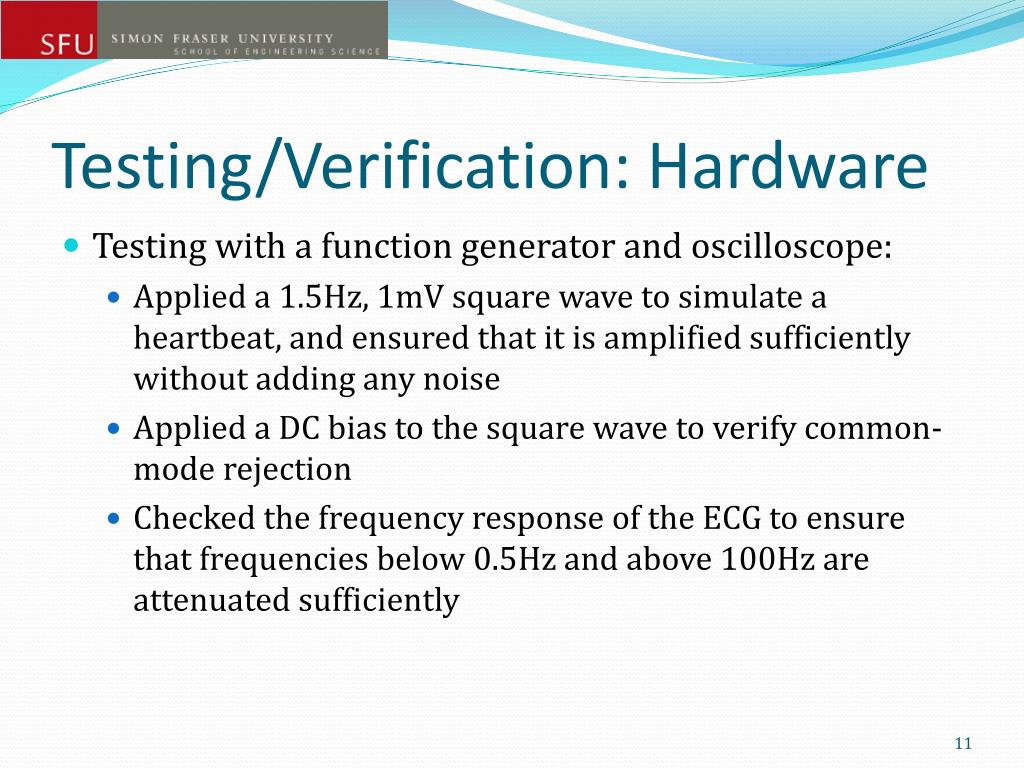 Testing/Verification: Hardware • Testing with a function generator and oscilloscope: • Applied a 1.5Hz, 1mV square wave to simulate a heartbeat, and ensured that it is amplified sufficiently without adding any noise • Applied a DC bias to the square wave to verify common-mode rejection • Checked the frequency response of the ECG to ensure that frequencies below 0.5Hz and above 100Hz are attenuated sufficiently