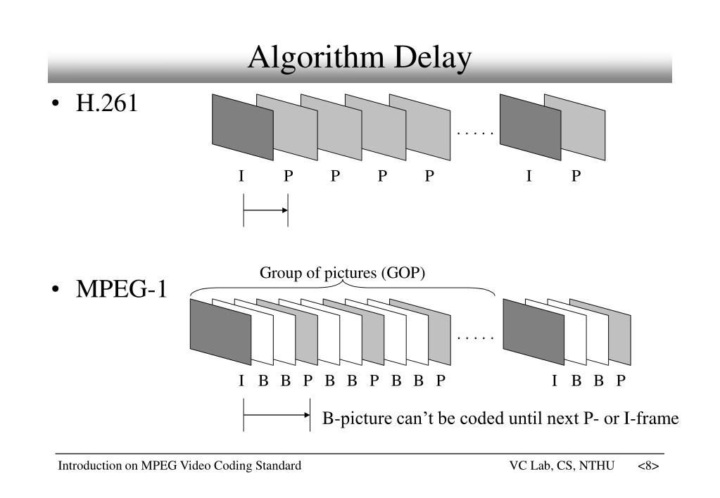 Algorithm Delay • H.261 • MPEG-1 B-picture can’t be coded until next P- or I-frame