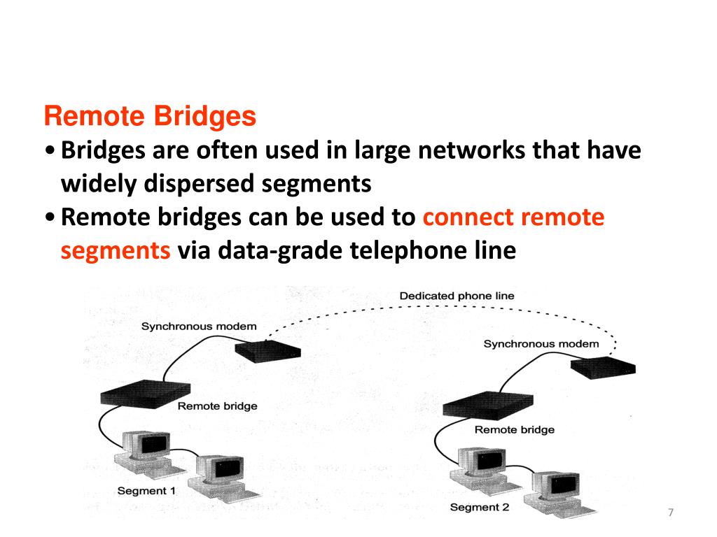 Remote Bridges • Bridges are often used in large networks that have widely dispersed segments • Remote bridges can be used to connect remote segments via data-grade telephone line
