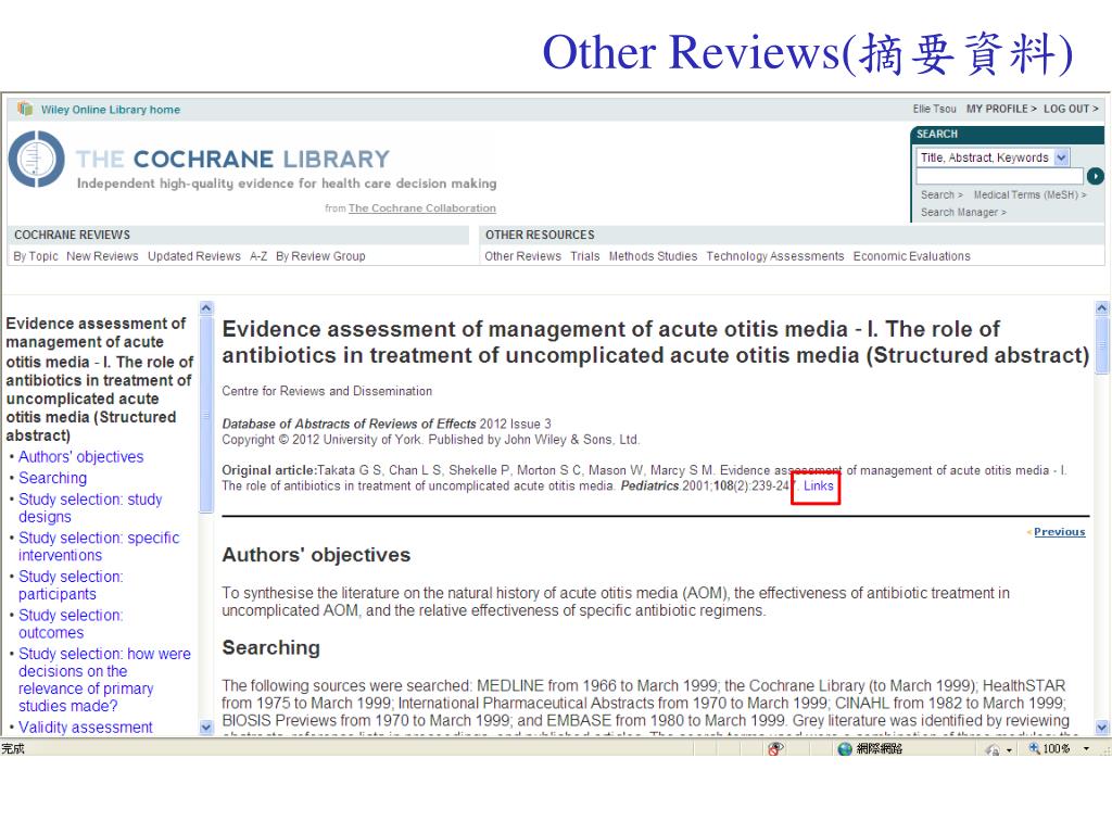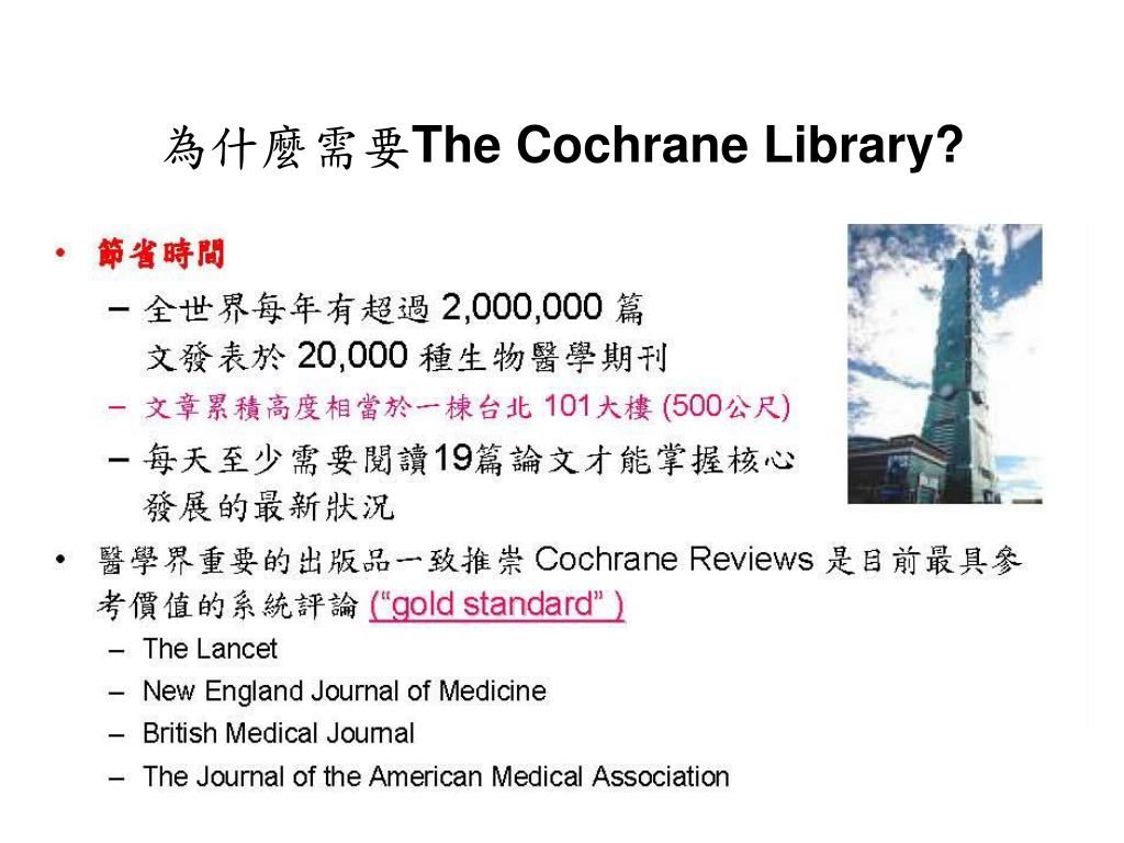 Systematic Review • 研究成果收錄成CDSR(Cochrane Database of Systematic Review) • 2-3年會重新進行資料收集及評讀