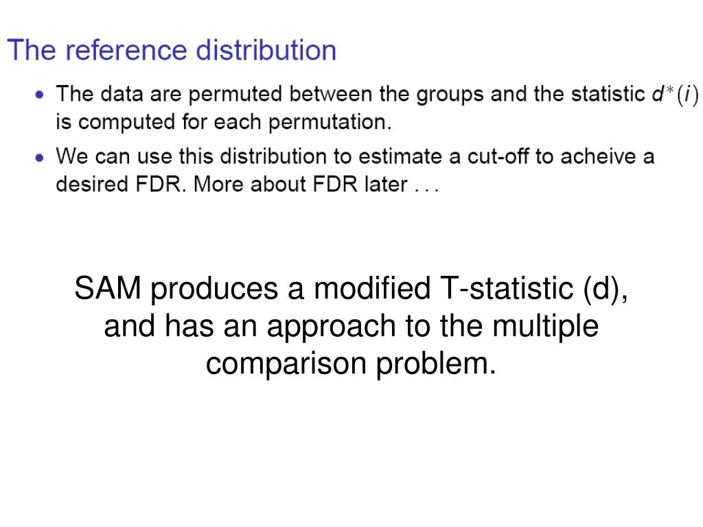 SAM produces a modified T-statistic (d), and has an approach to the multiple comparison problem.