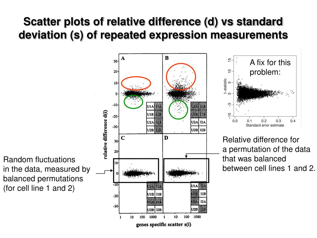 Scatter plots of relative difference (d) vs standard deviation (s) of repeated expression measurements A fix for this problem: Relative difference for a permutation of the data that was balanced between cell lines 1 and 2. Random fluctuations in the data, measured by balanced permutations (for cell line 1 and 2)