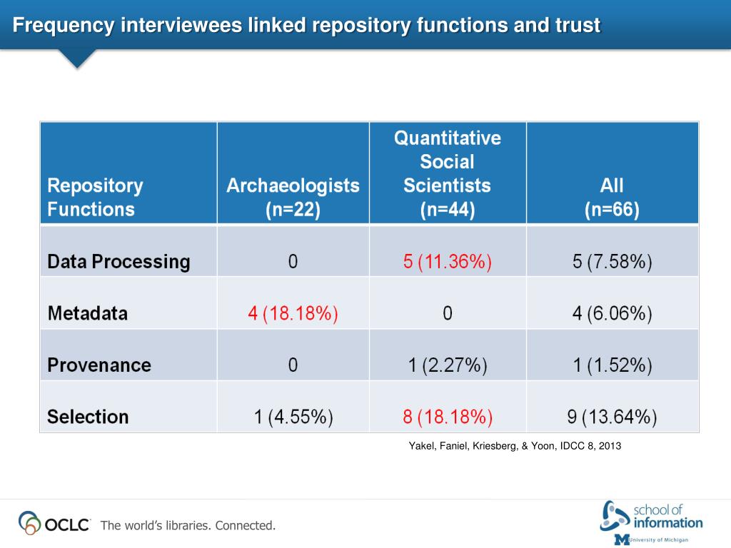 Frequency interviewees linked repository functions and trust Yakel, Faniel, Kriesberg, & Yoon, IDCC 8, 2013