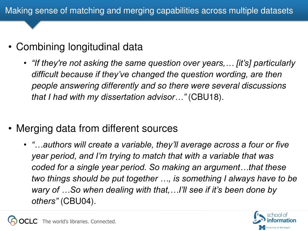 Making sense of matching and merging capabilities across multiple datasets • Combining longitudinal data • “If they're not asking the same question over years,… [it’s] particularly difficult because if they’ve changed the question wording, are then people answering differently and so there were several discussions that I had with my dissertation advisor…” (CBU18). • Merging data from different sources • “…authors will create a variable, they’ll average across a four or five year period, and I’m trying to match that with a variable that was coded for a single year period. So making an argument…that these two things should be put together …, is something I always have to be wary of …So when dealing with that,…I’ll see if it’s been done by others” (CBU04).