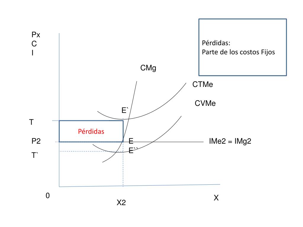 Pérdidas: Parte de los costos Fijos Px C I CMg CTMe CVMe E` T Pérdidas P2 E IMe2 = IMg2 E`` T` 0 X X2