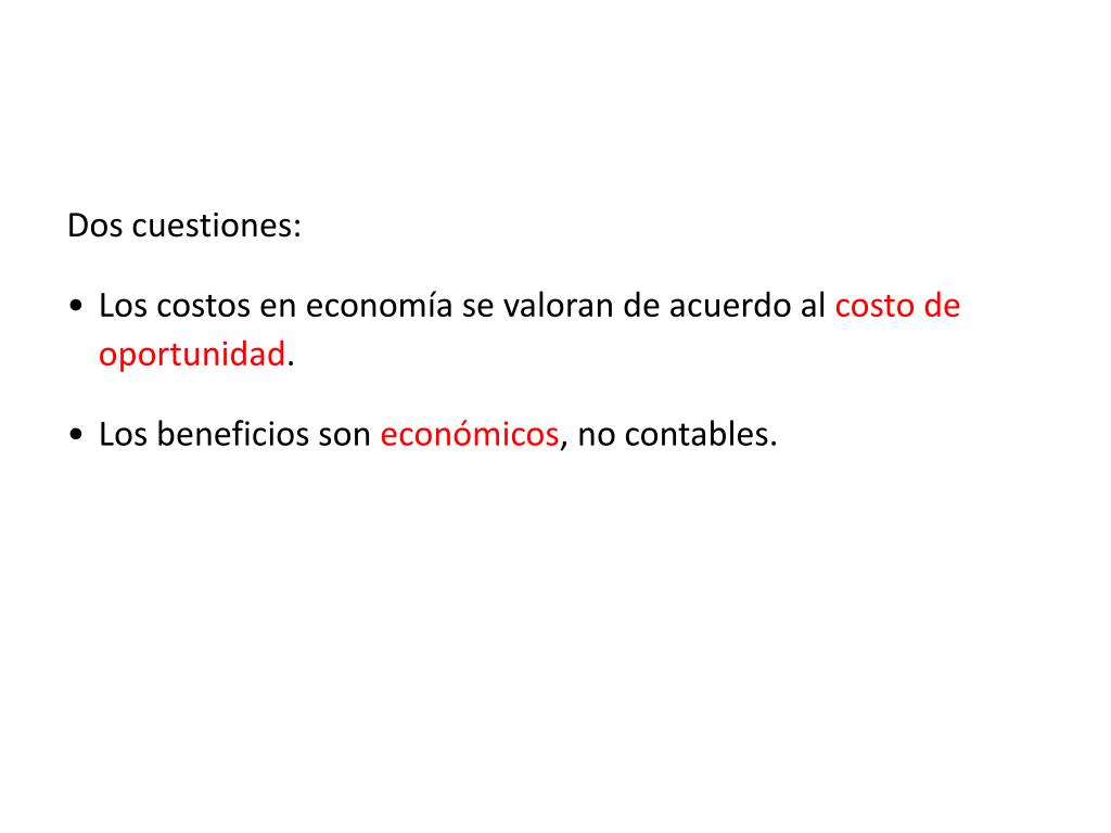 Dos cuestiones: • Los costos en economía se valoran de acuerdo al costo de oportunidad. • Los beneficios son económicos, no contables.