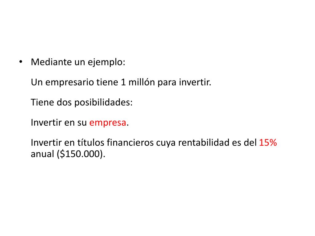 Mediante un ejemplo: Un empresario tiene 1 millón para invertir. Tiene dos posibilidades: Invertir en su empresa. Invertir en títulos financieros cuya rentabilidad es del 15% anual ($150.000).