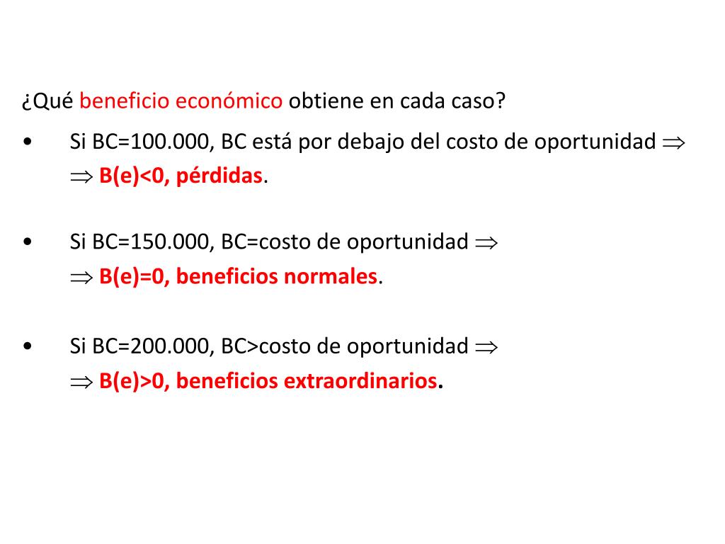 ¿Qué beneficio económico obtiene en cada caso? • Si BC=100.000, BC está por debajo del costo de oportunidad B(e)<0, pérdidas. • Si BC=150.000, BC=costo de oportunidad B(e)=0, beneficios normales. • Si BC=200.000, BC>costo de oportunidad B(e)>0, beneficios extraordinarios.