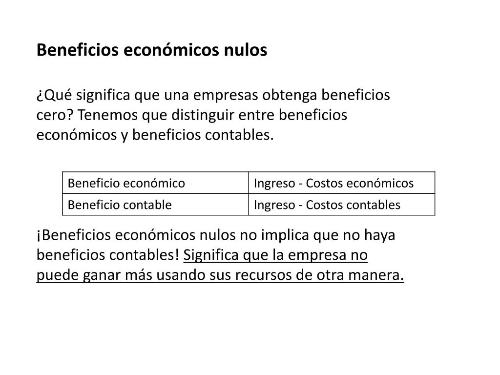 Beneficios económicos nulos ¿Qué significa que una empresas obtenga beneficios cero? Tenemos que distinguir entre beneficios económicos y beneficios contables. ¡Beneficios económicos nulos no implica que no haya beneficios contables! Significa que la empresa no puede ganar más usando sus recursos de otra manera.
