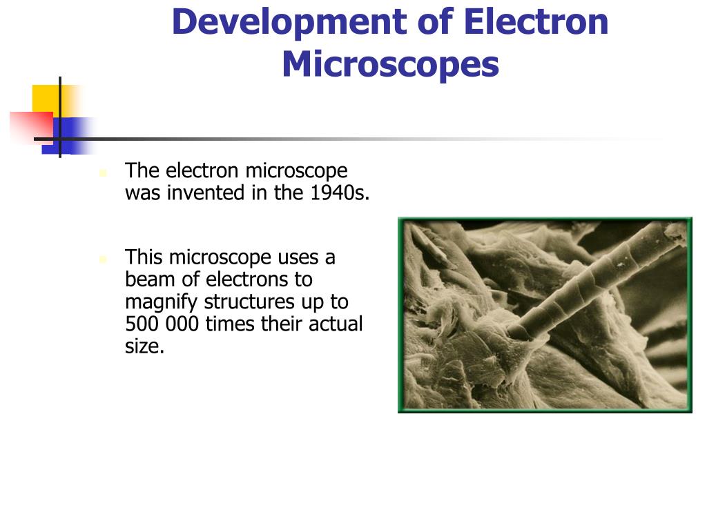 Development of Electron Microscopes • The electron microscope was invented in the 1940s. • This microscope uses a beam of electrons to magnify structures up to 500 000 times their actual size.