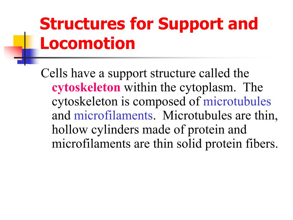 Structures for Support and Locomotion Cells have a support structure called the cytoskeleton within the cytoplasm. The cytoskeleton is composed of microtubules and microfilaments. Microtubules are thin, hollow cylinders made of protein and microfilamentsare thin solid protein fibers.