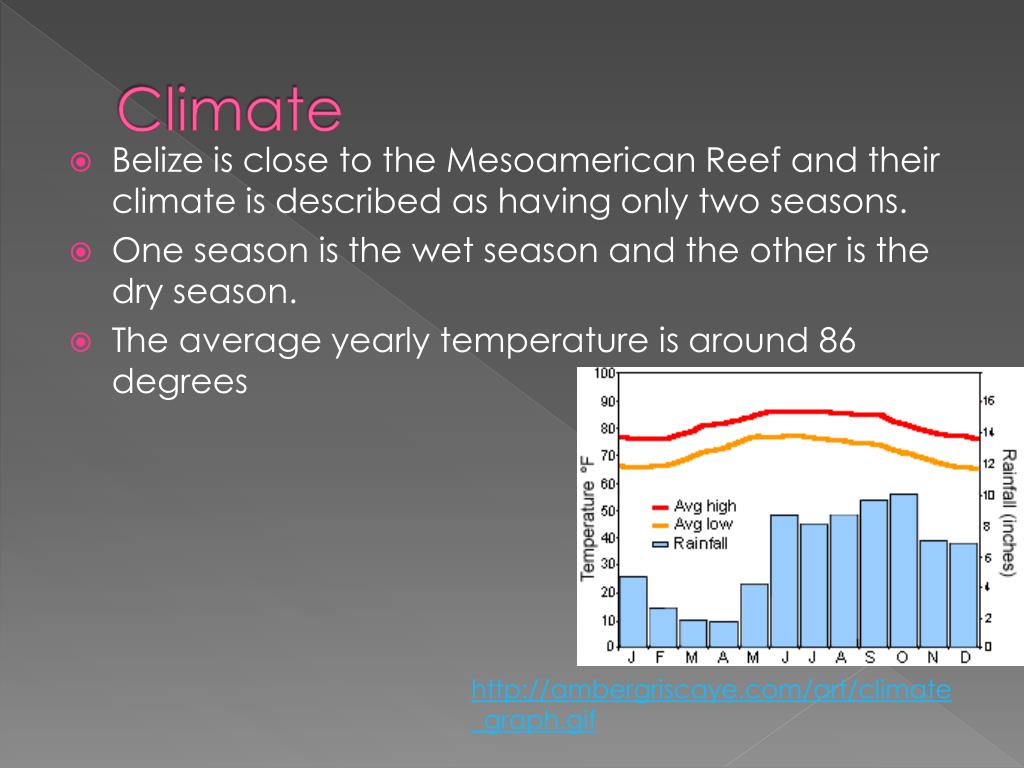 Climate • Belize is close to the Mesoamerican Reef and their climate is described as having only two seasons. • One season is the wet season and the other is the dry season. • The average yearly temperature is around 86 degrees http://ambergriscaye.com/art/climate_graph.gif