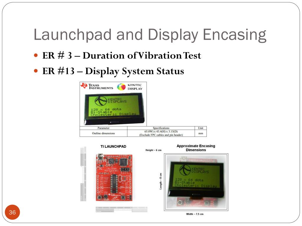 Launchpad and Display Encasing • ER # 3 – Duration of Vibration Test • ER #13 – Display System Status