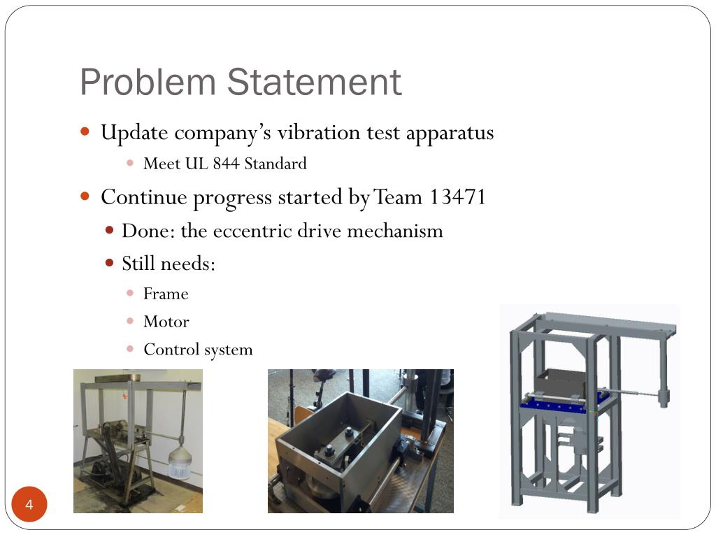 Problem Statement • Update company’s vibration test apparatus • Meet UL 844 Standard • Continue progress started by Team 13471 • Done: the eccentric drive mechanism • Still needs: • Frame • Motor • Control system