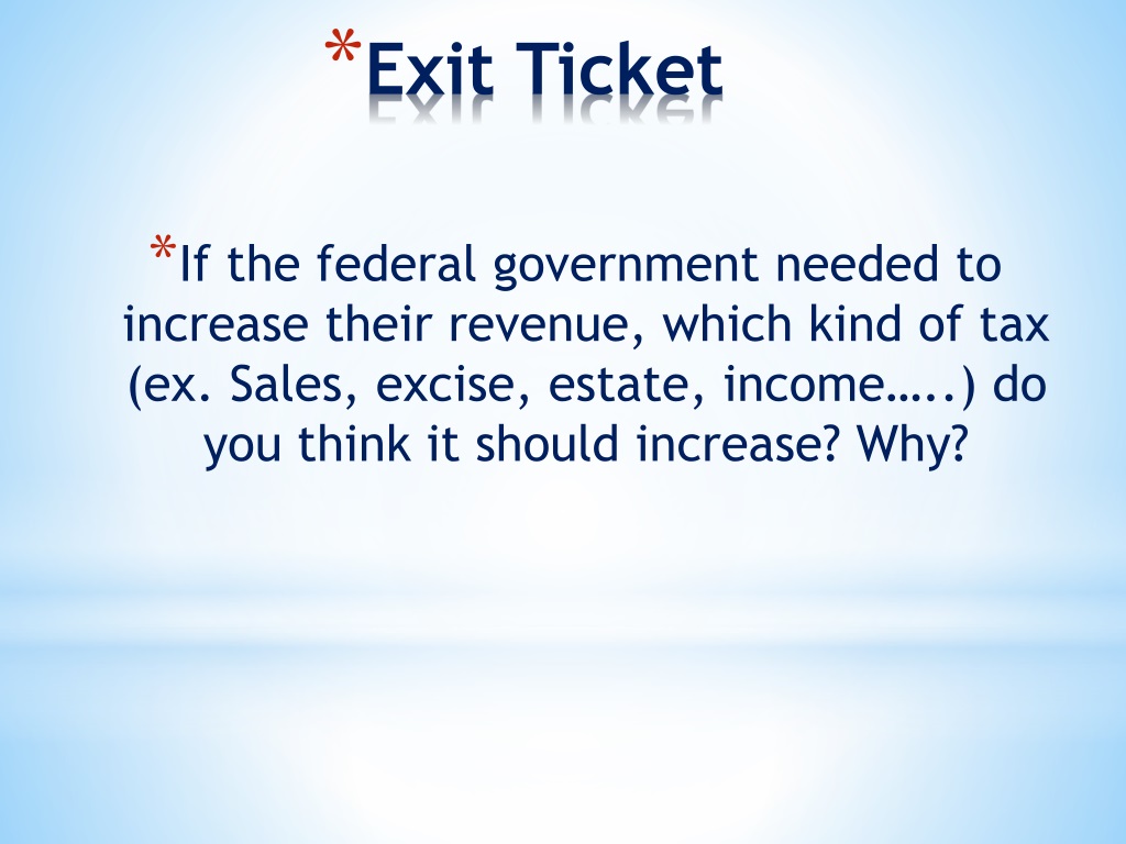 If the federal government needed to increase their revenue, which kind of tax (ex. Sales, excise, estate, income…..) do you think it should increase? Why? Exit Ticket