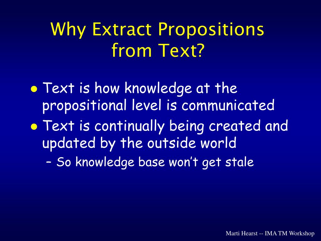 Why Extract Propositions from Text? • Text is how knowledge at the propositional level is communicated • Text is continually being created and updated by the outside world • So knowledge base won’t get stale Marti Hearst -- IMA TM Workshop