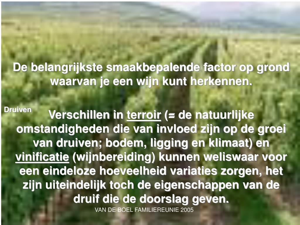Druiven De belangrijkste smaakbepalende factor op grond waarvan je een wijn kunt herkennen. Verschillen in terroir (= de natuurlijke omstandigheden die van invloed zijn op de groei van druiven; bodem, ligging en klimaat) en vinificatie (wijnbereiding) kunnen weliswaar voor een eindeloze hoeveelheid variaties zorgen, het zijn uiteindelijk toch de eigenschappen van de druif die de doorslag geven. VAN DE BOEL FAMILIEREUNIE 2005