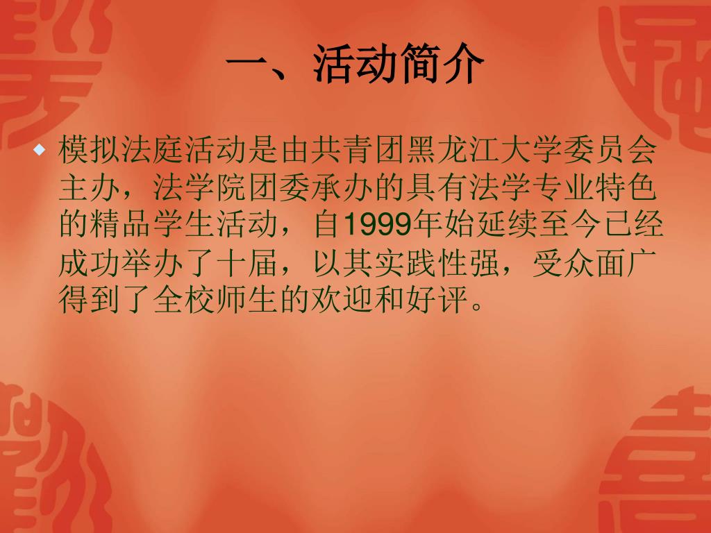 一、活动简介 • 模拟法庭活动是由共青团黑龙江大学委员会主办,法学院团委承办的具有法学专业特色的精品学生活动,自1999年始延续至今已经成功举办了十届,以其实践性强,受众面广得到了全校师生的欢迎和好评。