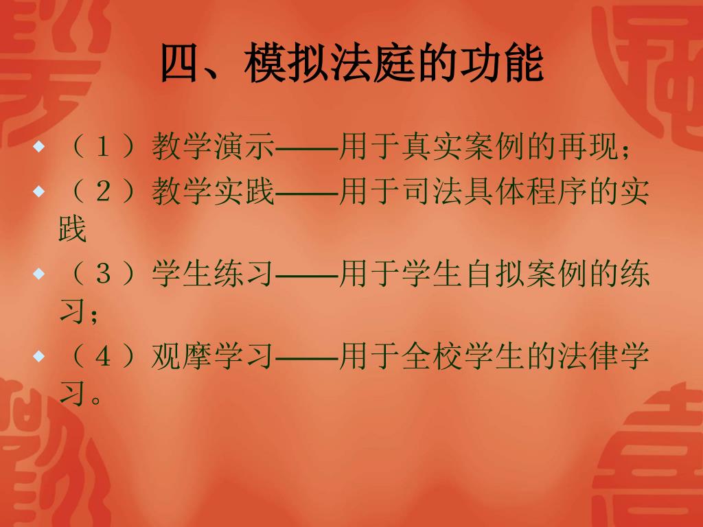 四、模拟法庭的功能 • (1)教学演示——用于真实案例的再现; • (2)教学实践——用于司法具体程序的实践 • (3)学生练习——用于学生自拟案例的练习; • (4)观摩学习——用于全校学生的法律学习。