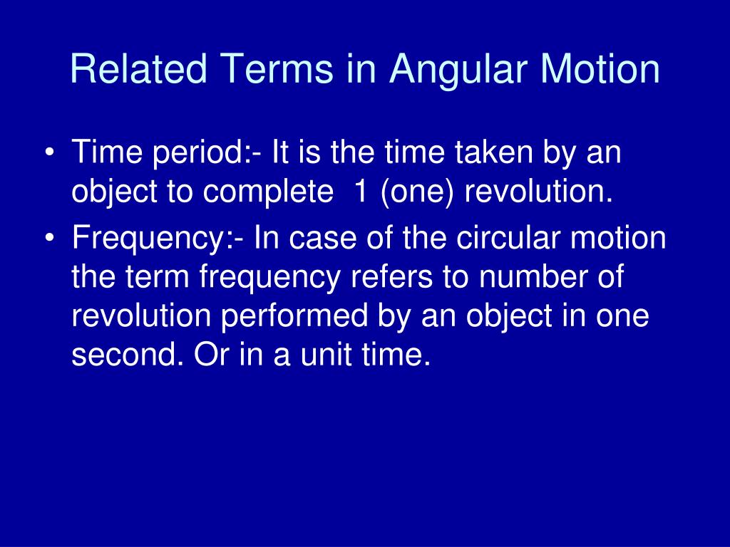 Related Terms in Angular Motion • Time period:- It is the time taken by an object to complete 1 (one) revolution. • Frequency:- In case of the circular motion the term frequency refers to number of revolution performed by an object in one second. Or in a unit time.